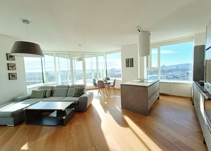 Просторные Sag Panorama Apartment 3 Rooms 19Th Floor Great View Free Parking Bratislava с террасой расположены в 25 минутах пешей прогулки от Фонтана Девочка с ланью.
